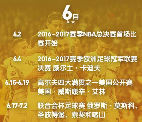 6月初,世乒赛将在德国举行,虽然是单项世乒赛,但争夺同样激烈,德国队坐拥主场优势,日本青年一代迅速崛起,他们能对抗强大的国乒吗?张继科、马龙、丁宁等奥运冠军能再次加冕吗?樊振东、朱雨玲等年轻一代能顺利接班吗?欧冠决赛也将在6月上演,两支欧洲俱乐部的代表将决战威尔士。NBA总决赛6月进行,骑士还是勇士?詹姆斯还是库里?还会再出现黑八奇迹吗?