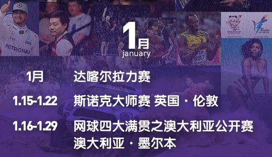 1月初,久负盛名的达喀尔拉力赛继续在南美大陆举行。中旬非洲国家杯也将拉开大幕,这里曾留下了米拉大叔、卡努、德罗巴等一代代非洲足坛巨星的足迹,今年赛会将在加蓬举办。16日新一季的澳网将在墨尔本揭开大幕,久违赛场的费德勒和纳达尔将有怎样的表现,新科世界第一穆雷与老对手小德之间的对话能如期上演吗?值得一提的是今年澳网决赛可是在中国的春节期间,躺在床上看大满贯不再只是梦想。