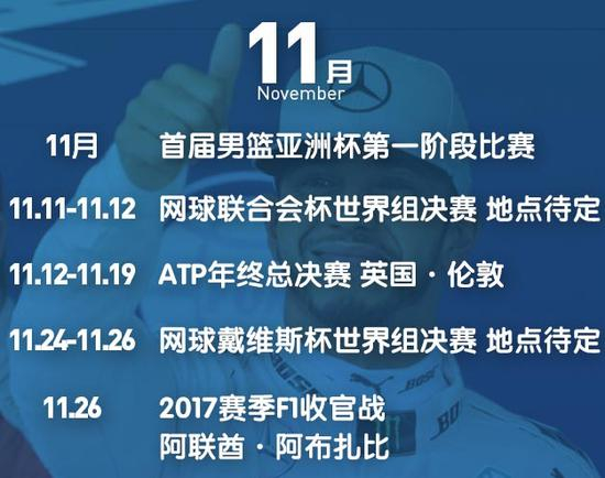11月蹦床世锦赛以及国际象棋世锦赛将陆续上演,F1收官,谁将成为新科车手总冠军,还记得去年夺冠后就退役的罗斯伯格吗?举重世锦赛将在月底美国上演,这是中国举重队后辈力量的一次检测,谁会在新周期扛起中国举重大旗呢?ATP年终总决赛结束后网球赛季也将收官,会有新的惊喜吗?