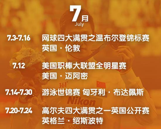 进入7月,温网将率先揭幕,老球王费德勒能在这里夺得个人的第18座大满贯吗?环法大赛今年谁将问鼎,游泳世锦赛将在霍思祖的祖国匈牙利举行,孙杨说他的目标是200、400、800和1500米四项自由泳,朴泰桓和霍顿也会参赛哦。洪荒少女傅园慧也会参赛,到时候又会有什么惊世骇俗之语和表情包出现呢?