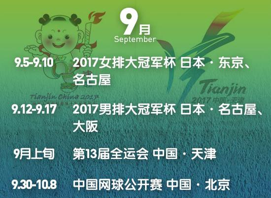 9月初,女排大冠军杯在日本揭幕,中国女排强势亮剑。9月的重头戏是天津全运会,这是中国国内水平最高的一项综合性赛事,也是各省市自治区以及行业体协实力的一次检测。体操世锦赛也将在9月进行,科马内奇将以大使的身份重回梦想开端的地方--蒙特利尔。