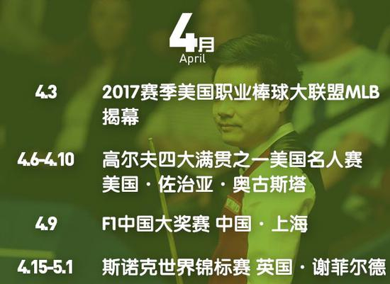 4月F1又一次来到中国,乒乓球亚锦赛也将在中国举办,迷弟迷妹们准备好了吗?跑步爱好者也不要错过了波士顿和伦敦两场重量级的马拉松赛事。中国香港在本月将举办场地自行车世锦赛,李慧诗能在主场加冕吗?宫金杰和钟天使两位奥运冠军又将有怎样的表现呢?