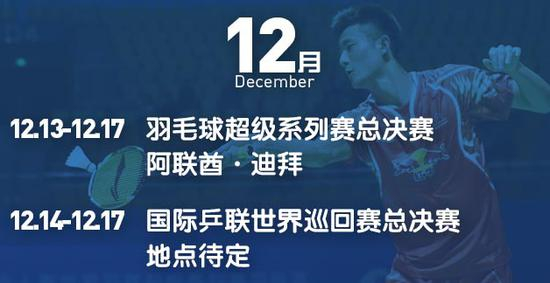 12月世俱杯以及乒联、羽联等总决赛将给2017年画上一个句号。此外跨年的NBA以及欧洲足球联赛仍然在如火如荼的上演。(汀苑)