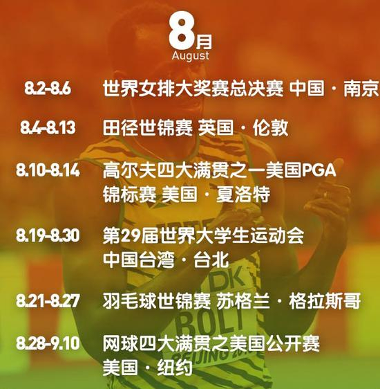 8月亚洲男排锦标赛将在印尼举行,中国男排继续为荣誉而战。女排大奖赛总决赛1组中国女排将在主场亮相。8月最重头的赛事当属田径世锦赛,伦敦的赛场将成为博尔特告别的舞台,传奇谢幕之战必定精彩纷呈。8月底美网揭幕,这次冠军又将花落谁家呢?小威能在本土继续书写传奇吗?