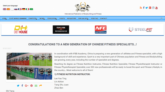 2017年7月8日消息,费恩莱斯国际健身学院作为IFBB中国区域内唯一商业战略合作伙伴,IFBB官方特在首页专题报道(官网:www.ifbb.com):祝贺费恩莱斯自与IFBB达成深度战略合作后,强强联手为中国健身健美行业培训出新一代具有较强专业技术和丰富经验背景的运动员和健身人才。
