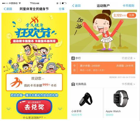已经在支付宝悄然运行了大半年的阿里体育,此次来到支付宝应用中心的“便民生活”开启“运动账户”,这也是此次“88全民健身狂欢节”的重头戏。现有的支付宝用户只需要一步简单操作便可成为阿里体育的会员,从而去完成“卡币换福利”的任务——“运动账户”采集和计算用户的运动数据,将运动消耗的卡路里演化成卡币,在运动商城里兑换商品。奖品包括实物以及培训、票务、场馆预定等服务类商品,本次活动中有Apple Watch、运动手环、健身卡以及购物优惠券等。