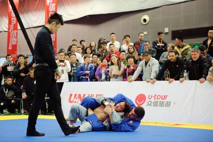 深秋的首都,艳阳煦暖,天朗气清。通过严格的安检,步入位于通州区的规模宏大的李宁体育中心,只见宽敞的体育馆内人头攒动熙熙攘攘,热闹非凡。来自中国和世界各地的数百位运动员、教练员、裁判员、赛事工作人员,社会各界应邀佳宾及广大热心观众济济一堂,共同见证了霍姆兰德(北京)文化发展有限公司巴西柔术专项体育赛事在国内的首次盛会。宽敞的运动馆中央,四方色彩艳丽的比赛专用柔术垫整齐安放,尤为醒目。场地一边,两块超大电子视频比肩而立。其一现场播放比赛实况,使竞技过程尽收眼底。另一块则是赛事合作方“乐旺科技”增设的观众互动游戏平台。这家互娱系统的领跑者引入的大屏游戏玩法,使观众在观赏比赛的隙间,现场用手机参与游戏,横生妙趣,为赛事增色助兴。