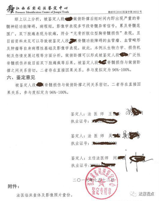 《江西求实司法鉴定中心司法鉴定意见书》中得出的最终结论为:“本例从生物力学、损伤机脊髓损伤并致目前双下肢瘫痪等后果,被鉴定人小琪脊髓损伤与做俯卧撑之间关系密切,二者存在直接因果关系,参与度拟定为96%~100%。”