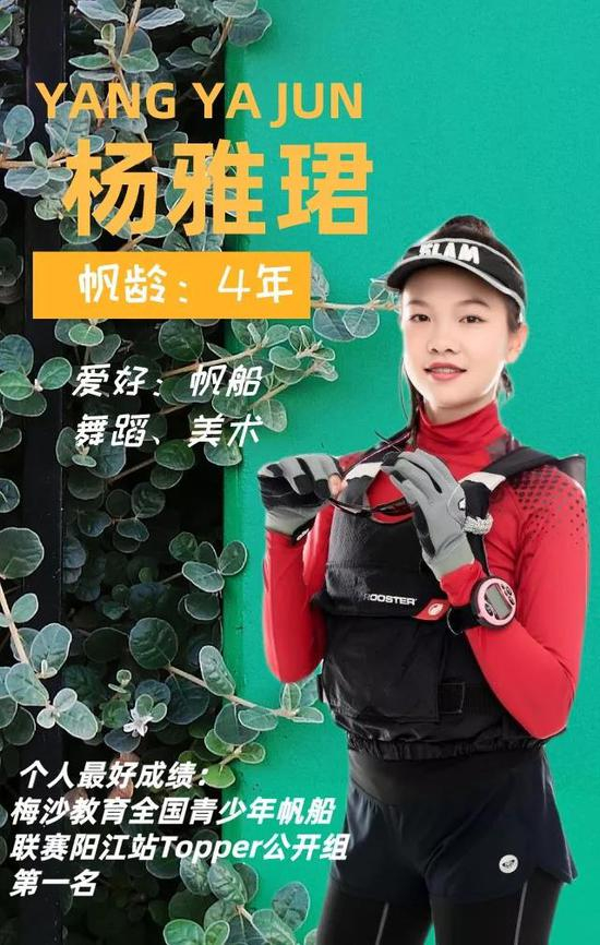 自从雅珺在2017年获得了世锦赛资格之后,她就告诉身边的朋友、同学,邀请大家一起加入帆船的大家庭。在小学时,获得了老师的大力支持,利用脱口秀时间为同学们讲解帆船的知识,申请活动,虽然后来没能成功的让班里的同学们体验,但是却让大家了解到了这个项目。在进入初中后,雅珺继续向同学们介绍帆船,并申请了帆船的相关项目,现在正在筹备组建学校帆船队,希望更多的人能够加入进帆船的大家庭。