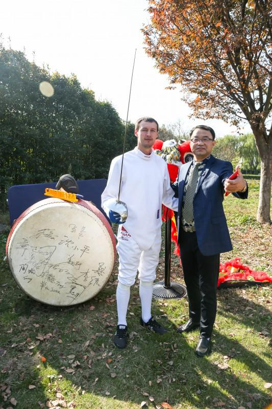 图:欧姆斯达国际击剑运动学院金牌主教练,国际职业佩剑运动员、2010年世界杯的比赛冠军,伊万·鲍姆克和浦东新区政协副主席李伟民。