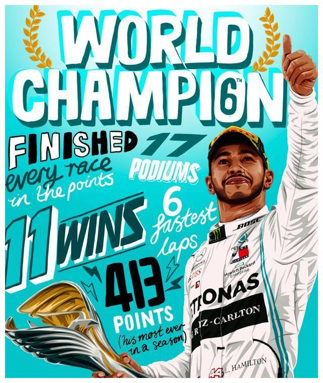12月1日,汉密尔顿在F1阿布扎比站杆位发车获胜,拿到本赛季个人第11个分站冠军,他以413分的总分再夺世界冠军。汉密尔顿成为继迈克尔-舒马赫后第二位6冠王。梅赛德斯车队再次拿到车队总冠军,这是他们连续第6个赛季获得车队总冠军。2019赛季结束后,在分站冠军次数榜上,汉密尔顿距离舒马赫的91个分站冠军只差7个。