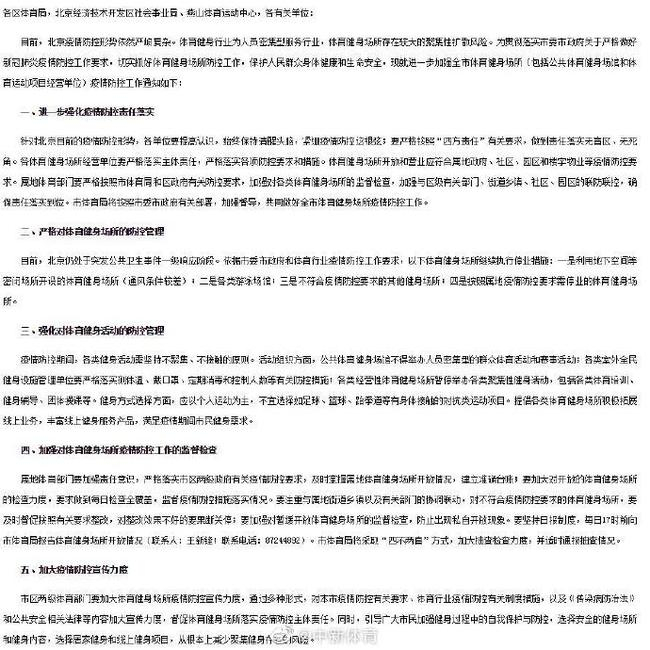 针对北京目前的疫情防控形势,各单位要提高认识,始终保持清醒头脑,紧绷疫情防控这根弦;要严格按照“四方责任”有关要求,做到责任落实无盲区、无死角。各体育健身场所经营单位要严格落实主体责任,严格落实各项防控要求和措施。体育健身场所开放和营业应符合属地政府、社区、园区和楼宇物业等疫情防控要求。属地体育部门要严格按照市体育局和区政府有关防控要求,加强对各类体育健身场所的监督检查,加强与区级有关部门、街道乡镇、社区、园区的联防联控,确保责任落实到位。市体育局将按照市委市政府有关部署,加强督导,共同做好全市体育健身场所疫情防控工作。