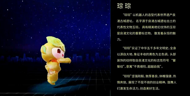 “琮琮”以机器人的造型代表世界遗产良渚古城遗址,名字源于良渚古城遗址出土的代表性文物玉琮。其全身以源自大地、象征丰收的黄色为主色调,头部装饰的纹样取自良渚文化的标志性符号“饕餮纹”,寓意“不畏艰险、超越自我”。