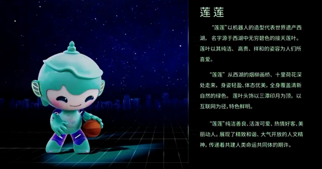 “莲莲”以机器人的造型代表世界遗产西湖,名字源于西湖中无穷碧色的接天莲叶。其全身覆盖着清新自然的绿色,莲叶头饰以三潭印月为顶,以互联网为径,特色鲜明。