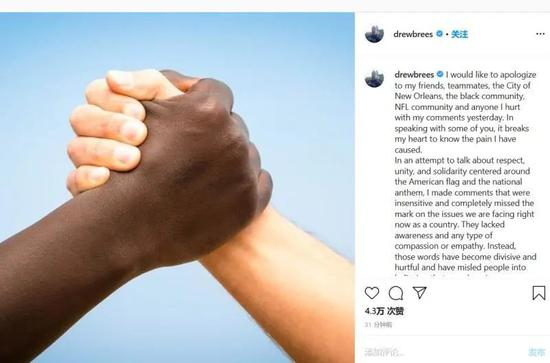 德鲁-布里斯的这番言论一经发出,就遭到全网强烈批评,NFL,NBA,MLB的很多有影响力的黑人球员都站出来对其说法表示愤怒。