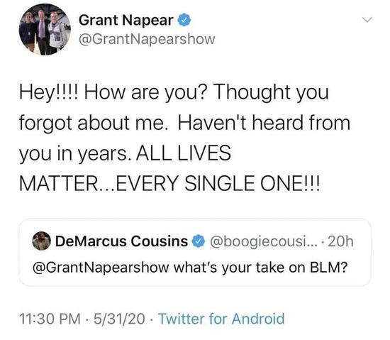 事情的起因很简单,考辛斯在抗议发生后在推特上向内皮尔提问:“你怎么看待BLM呢?”BLM是“Black Lives Matter”的缩写,意为“黑人的命也是命”,这句话是此次事件里最主要的话题之一。