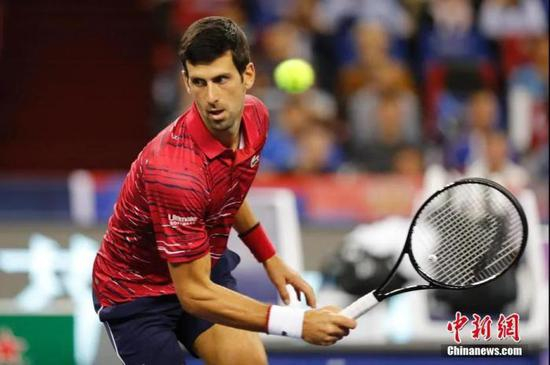 德约科维奇在比赛中回球。当日,在2019年上海大师赛男子单打四分之一决赛中,塞尔维亚选手德约科维奇以1比2不敌希腊选手西西帕斯,无缘四强。中新社记者 殷立勤 摄