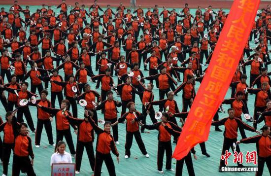 资料图:2014年9月24日上午,在青岛天泰体育场,2000名老人共同舞动柔力球,祝贺市南区第二十一届老年人运动会开幕。中新社发 徐崇德 摄