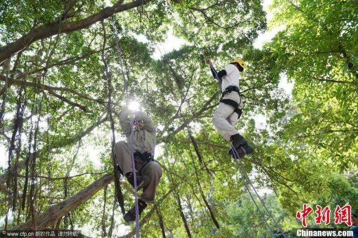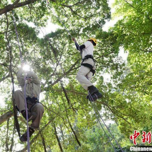 “爬树课”选用的树木通常四五层楼高,树径要达到十几厘米以上。上课之前,老师会亲自对攀爬的树木进行“踩点”。攀树时会在树上设定防下坠的装置,学生要佩戴头盔、护目镜,穿着长衫长裤、安全靴后才能上树。