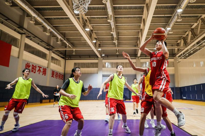 在篮球训练馆里,上海女篮青年队的姑娘们进行着对抗训练,不时地喊着“加油”,给自己和队友鼓劲。女篮青年队主教练焦岚告诉记者,“训练很辛苦,但我跟队员们讲,你们在室内训练条件太好了,把她们拉到田径场、看棒垒球队训练,要培养她们能吃苦的意志品质。”