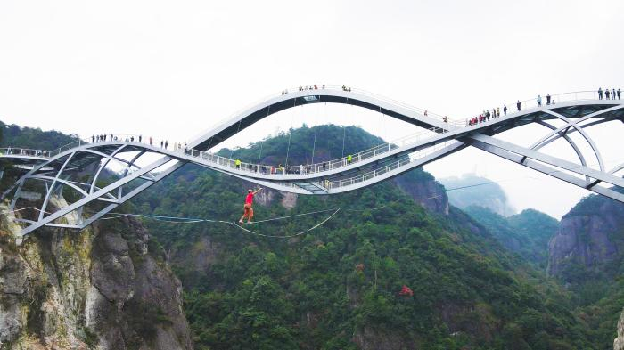 游客乘坐索道上山后,再向上前行几百米到达如意桥,如意桥边,是一条200米长的扁带,可以看到有人在上面行走、表演。在桥上,140多米高的落差就让人头晕目眩,离桥10几米远处,一根细长的扁带同样横跨东、西峡谷,有人在上面抬起双手维持平衡慢慢行走——而且是倒着走,摇摇晃晃令观者为之揪心。