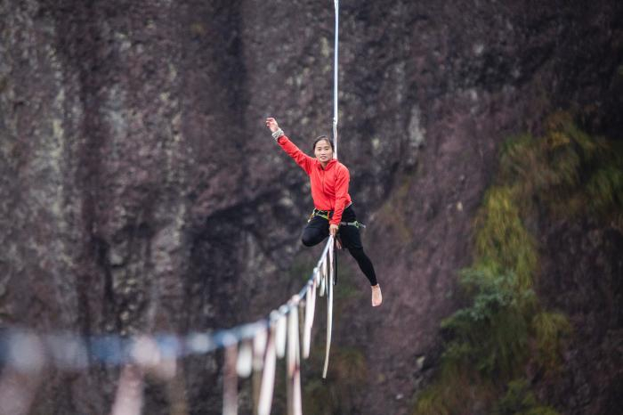 140米高空倒走如履平地! 女飞人问鼎扁带挑战赛