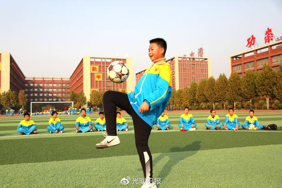 10月25日,河北省衡水市志臻学校安平校区,学生进行足球颠球项目比赛。本报记者 郭俊锋摄/光明图片