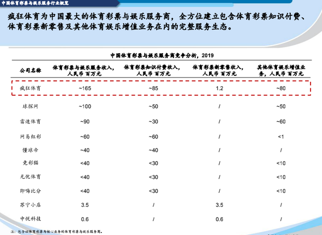 据了解,疯狂体育于2012年成立,于2018年被第一视频集团收购。其用户以忠实彩民为主,覆盖大量原中国足彩网与彩票365用户,总规模近2亿;拥有超300名头部专家,均为中国顶级足篮球专家、运动员等体彩专家资源;合作渠道包含懂球帝、虎扑、直播吧、腾讯体育、一点资讯等二十余个平台。2019年,疯狂体育的体育彩票知识付费收入达8千5百万元;体育彩票新零售收入120万元 ;其他体育娱乐增值业务收入8千万元。