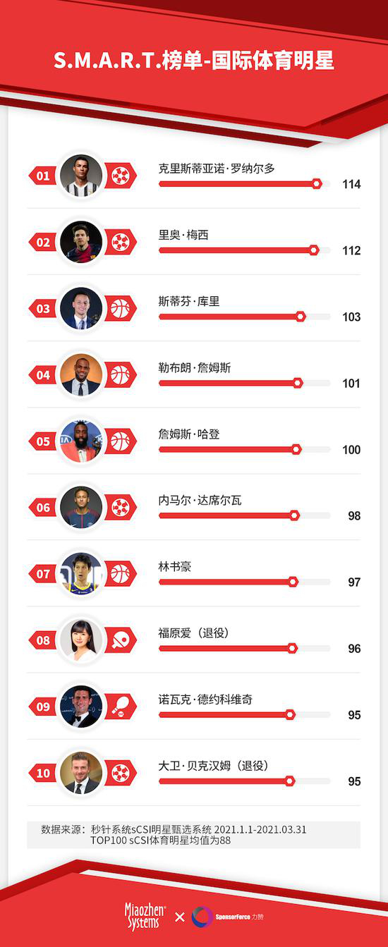 基于秒针系统sCSI体育明星甄选系统*及SocialMaster社交数据库,结合大数据、营销、体育领域顶级专家的意见,此次秒针系统和力赞体育联合推出的“S.M.A.R.T。指数-体育明星版”,是本指数针对中国市场消费环境下的不同国籍,不同职业阶段的体育明星的商业影响力,用数据化可视化方式体现的一次尝试。