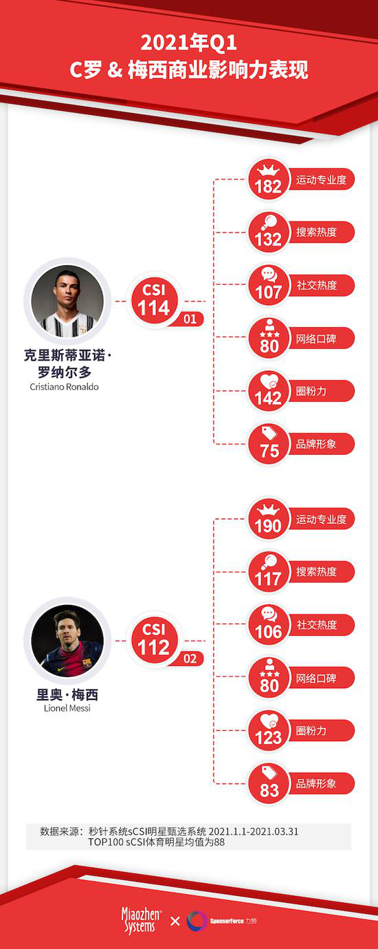 在国际体育榜中,足球和篮球是当之无愧的超级造星项目。在TOP榜中各自占据4个名额,数量上难分伯仲。但从CSI数值上看,前两名明显和第三名拉开了差距,这两位就是C罗和梅西。
