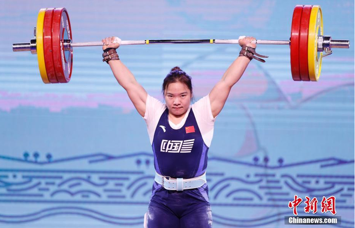 9月16日,第十四届全运会举重女子49公斤级决赛在陕西渭南举行,湖南队选手侯志慧以抓举96公斤、挺举118公斤、总成绩214公斤夺冠。图为侯志慧在比赛中。 中新社记者 蒋启明 摄