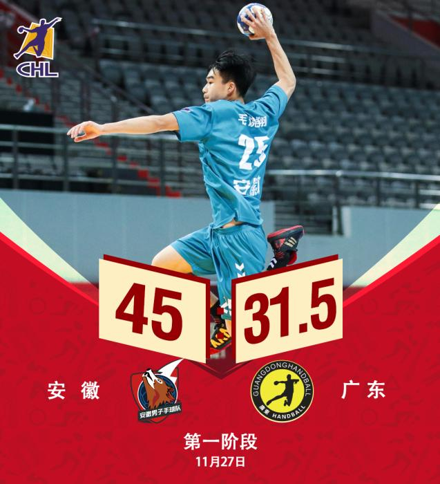 中新网北京11月28日电 记者从赛事组委会获悉,2021中国男子手球超级联赛27日进入第七比赛日,这也是苏州赛区最后一轮比赛。在“粤皖对决”中,全场占优的安徽男子手球俱乐部以45:31.5击败广东男子手球俱乐部,在第一阶段比赛交出了一份5胜1负的漂亮成绩单,广东队战绩则为2胜4负。