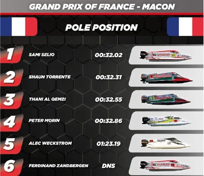 在2022国际摩联F1摩托艇世界锦标赛法国站排位赛中,中国深圳天荣F1摩托艇队赛手莫林连战三轮,最终以第4名的成绩进入明日决赛,菲利普·洽培重归赛场,取得第9名不俗成绩,沙迦赛队名将萨米·瑟里奥夺得杆位。