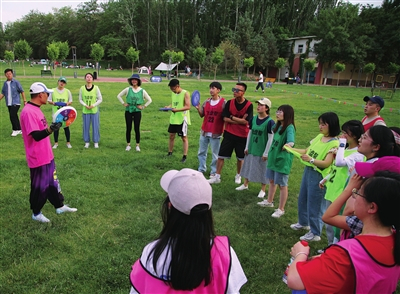 6月11日下午3点30分,在森林公园宽敞的大草坪上,银川飞盘教练刘治华正在向众多喜爱飞盘运动的新手学员讲授飞盘运动的入门课。通过1~2个小时的入门讲解,足以让新学员掌握一场7人制飞盘比赛的基础规则。简单、易玩,是飞盘的标签。“飞盘上手快,社交属性强,每次训练活动都会有不少新人参加。”刘治华说。