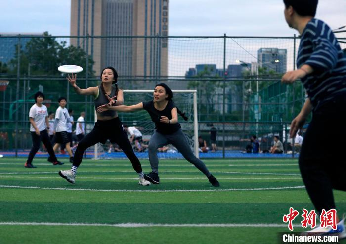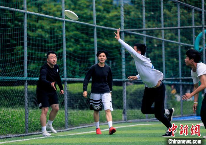 中新网成都6月12日电 (单鹏)12日上午,一场飞盘训练赛正在成都某足球场火热进行。成都市民葛浩摆好姿势、用力一掷,飞盘在空中划过一条平缓的抛物线。“飞盘运动正在朋友圈里快速升温,‘以盘会友’是周末的必选项。”接触飞盘不足一个月的葛浩坦言,自己已然是这项运动的“发烧友”。