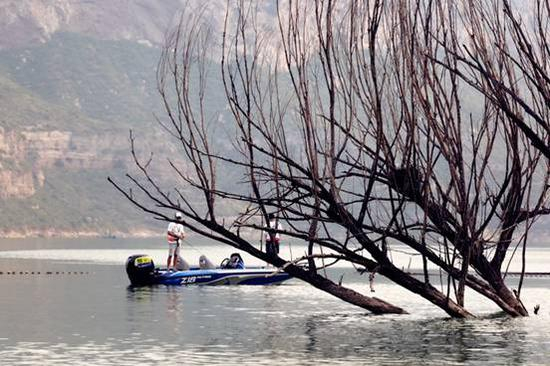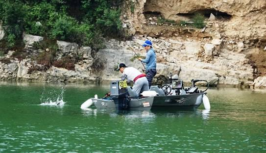 首日非常炙热的标点,二库的“大树”早已被围得水泄不通,首日排名第一的吴新茂、余宗友早上出发未能赶上好的位置,抛了几竿之后,发现船只太多,果断从“大树”退了出来,采取在附近沿岸迂回搜索,两人一快一慢,整个一个上午收获了四尾有效鱼,可惜是个体太小。随后的时间,他们很长一段时间没有上鱼,时间到了中午前后,余宗友抓住了一个清晰的咬口,擒获一尾1.11公斤的大鲈,鱼入抄网的瞬间,仰天长呼一声,这尾大鲈来的太及时了。此时离比赛结束还有2小时左右,他们没有丝毫的怠慢,不停的搜索抛竿,想以此获得更多的咬口来替换活鱼箱中的鱼,遗憾的是,直到比赛结束,未能实现替换,最后总重定格在6.75公斤。