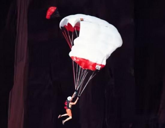极限爱好者峡谷挑战悬崖跳伞 百米高空自由落体
