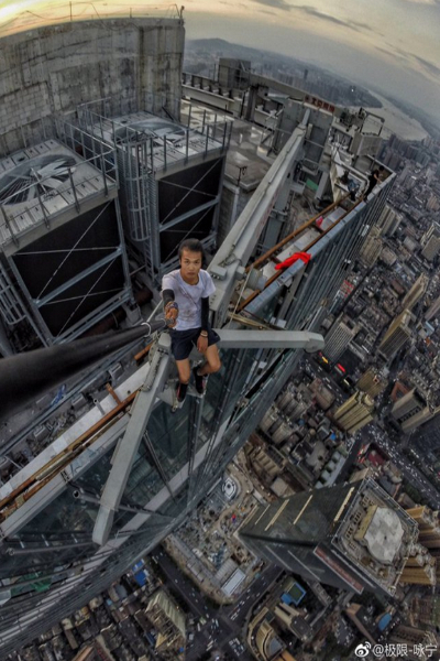 10月16日,记者在微博中搜索发现,拍摄者为网友“极限-咏宁”,其微博头像是一张单脚站立的背影照,周围全是高楼大厦。该名网友在微博简介中表示,自己是国内极限高空运动挑战第一人,目标是在无任何保护措施下挑战全世界高楼大厦。