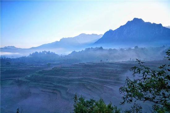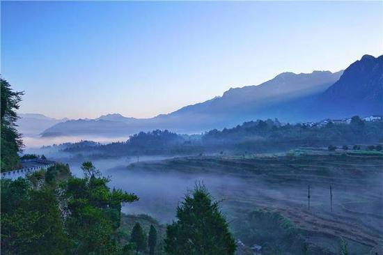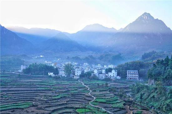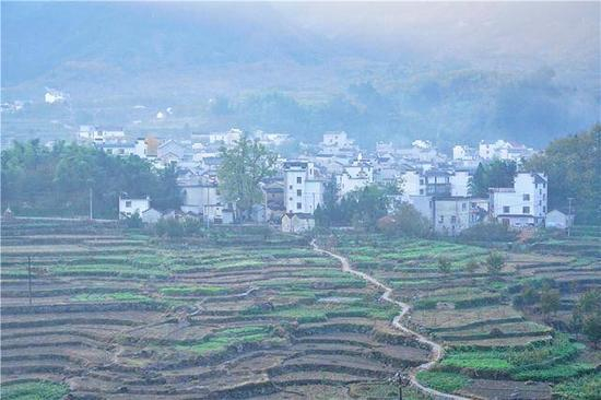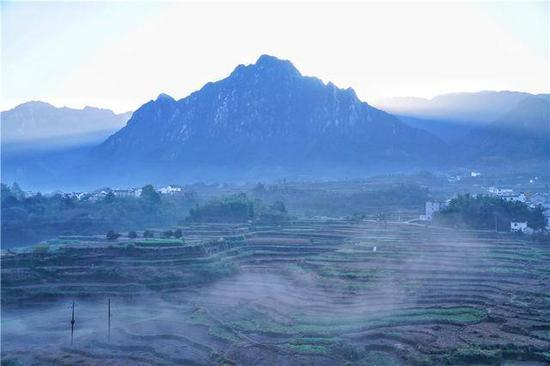 沿着盘旋的山间公路一路飞驰,每一次弯道转折都会让人心跳加速,而路边的风景也变得越来越美,薄薄的云雾环绕在青山间,山间的微风轻轻吹动,流动的云雾让整个青山越发显得妩媚。从梅干岭观景台俯瞰,层层梯田和白墙黑瓦的村庄在愈来愈浓的云雾缭绕中若隐若现,眼前的一切,宛若走进了一个梦幻的童话故事里。