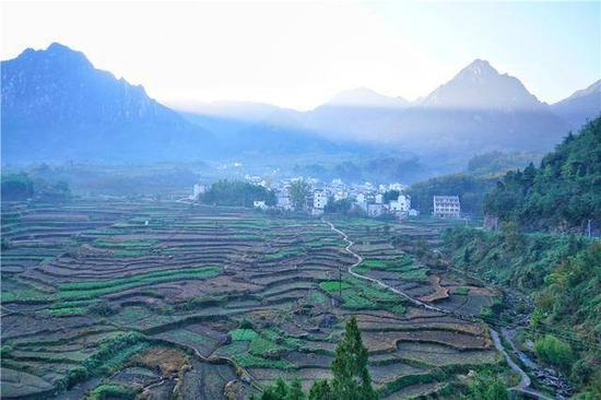 梅干岭位于皖浙天路上,也是观赏天路风光的绝佳处,崇山峻岭中,凭栏远眺,一派田园风光图,层层梯田的远处是白墙黑瓦的徽派建筑,背倚着青山,在飘渺的云雾中时隐时现。