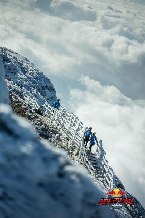 经过8小时强制休息,11月26日凌晨4时许,领先的队伍陆续出发。顶着夜色向4223米的轿子山顶峰发起冲击,不断升高的海拔和不断降低的气温,加上山间浓雾中密林湿滑的栈道,对选手的应变能力和高原能力提出更大挑战。随着太阳渐渐升起,第一支队伍到达海拔4000多米的顶峰区域,经过智力拼图、吹箭等项目比拼,队员们在垂直高度80多米的月亮岩进行岩降。