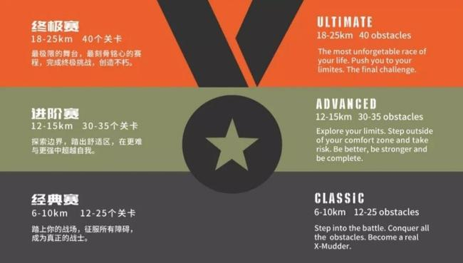 品牌升级后的X-Mudder泥泞障碍赛,将带给参赛选手全新的赛场体验。首先,升级后的赛事关卡在体能和心理上增加了挑战难度;此外,升级后的关卡命名于历史上的经典战役,丰富的背景联想与场景相融后,加上战士们的亲身体验将带来感官和共鸣上的升级。2018年的赛场上,将会有超过60%的关卡是全新设计和制作的,而保留的经典关卡也会变得更加具有挑战性。其次,升级后的赛事体系更加完善;新体系依据赛事难度由低到高分为经典赛、进阶赛和终极赛。经典赛是新体系中的基础赛事,面向所有敢于打破束缚,征服障碍的“战士”;进阶赛相较于经典赛,赛道更长、关卡更难,需要“战士”们在挑战过经典赛后,继续超越自己。终极赛作为赛事最极限的舞台,包含各项终极挑战,它将成为“X-Mudder战士“最刻骨铭心并值得骄傲的参赛之旅。所有选手均可以经典赛的优异成绩或X-Mudder赛事训练营优异成绩拿到进阶赛门票;同理,进阶赛优异成绩也将是您终极赛的唯一邀请函。新赛季中所有比赛都将计时,在更加突出比赛竞技性的同时,也会根据完赛时间发放对应的奖励与徽章。