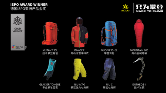 据户外用品分会统计,在中国市场销售的品牌达975个,其中近半来自国外。相比过去,中国户外运动市场的竞争越发激烈。KAILAS凯乐石在产品研发上大量投入,在材料上精亦求精,研发最尖端最前延的技术,成为全球顶尖户外用品材料供应商在中国最大最紧密的合作伙伴,七个产品一年横扫欧洲七个产品设计大奖,成为全球品牌最大的赢家。