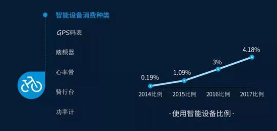 随着更多赛事的举行,骑行者们的科学训练消费习惯也在逐渐养成。GPS智能码表、踏频器、心率带、功率计等等在过去阳春白雪的专业设备,现在也走入了寻常车友家。而使用智能设备的比例也在逐年升高,从2014年的0.19%到2017年的4.18%,相信未来这一数字还将以指数倍增长。