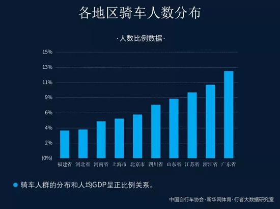 经济水平越高,当地民众就越热爱从事骑行运动。2017年国内GDP排名前六名的省份依次是广东、江苏、山东、浙江、河南、四川,而骑行人数在各地区的分布比例排名基本与此接近。