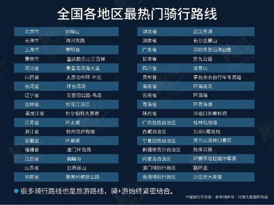 《报告》显示,北京的妙峰山、四川的龙泉山、湖南的岳麓山、重庆的歌乐山三百梯、浙江的龙井爬坡等国内一二线大城市的近郊风景线路,成为所在省市最热门的骑行线路。而台湾省的环台湾岛、上海市的崇明岛、海南省的环海南岛、福建的厦门环岛路,环岛骑行成为当地最热门的骑行线路。