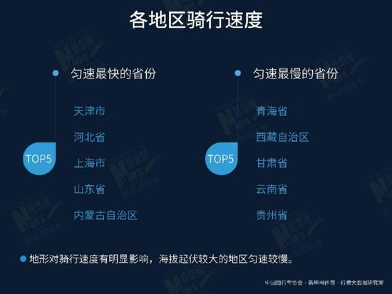地形对骑行速度有着明显影响,一般来说,海拔起伏较大的地区匀速较慢。《报告》显示,地处高原的青海、西藏自治区、云南、贵州等地的骑行速度在全国是最慢的。但一方水土见一方性格,天津、河北、山东、内蒙古自治区等北方汉子女士们,用最快的骑行速度印证了他们的个性——风风火火不落于人。