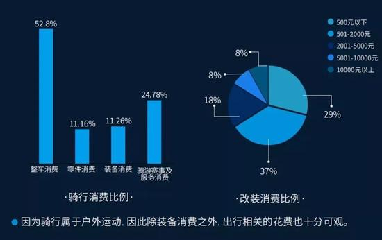 因为骑行属于户外运动,因此除装备消费之外,出行相关的花费也十分可观。虽然整车消费在骑行消费中的占比高达52.8%,但是骑游赛事及服务消费现在已经跃居第二,高达24.78%,远高于零件和装备消费的占比。