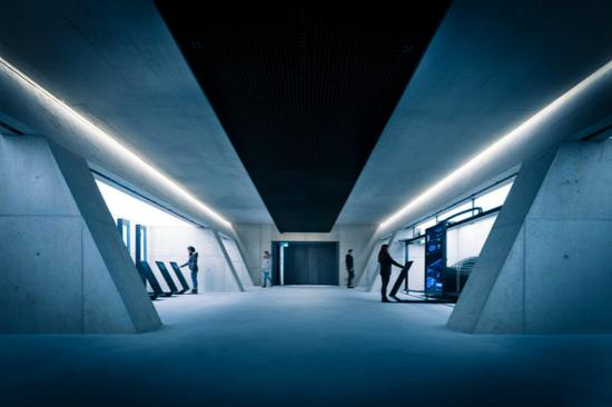 博物馆的外观和内部设计都源于已故007制作设计师肯·亚当的作品,特别是他对动态角度和几何形状的使用,以及他使用材料的柔和调色板。Obermoser则使用与山区相呼应的混凝土,将设计的建筑与周围环境融为一体。