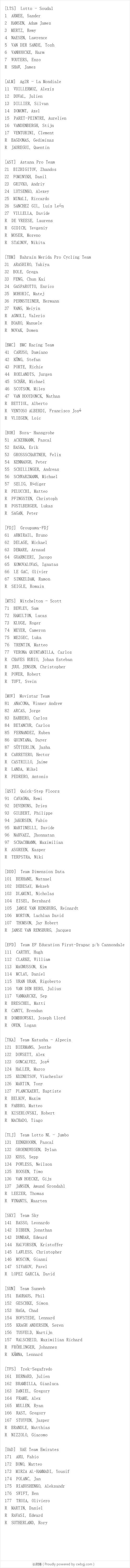 除此之外,来自绿刃车队的新科欧洲冠军特伦丁、天空车队的前U23世界冠军哈沃尔森、英孚教育车队的麦克莱等人都有机会争夺平路赛段的高排名。